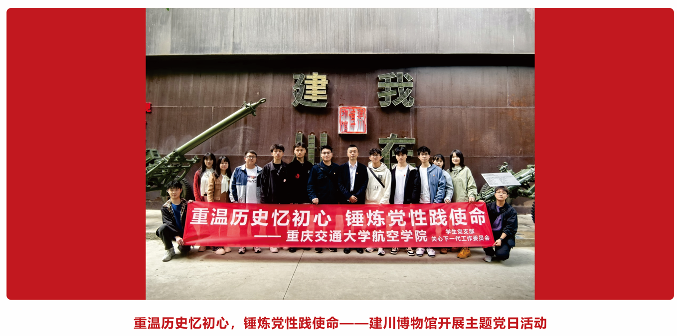 🏠 党支部简介 重庆交通大学航空学院学生党支部现有党员48名。支部始终坚持以立德树人为根本,以航空报国为理念,秉承"党建引领团建,五育融合育人"的工作思路,致力于培养高素质党员,服务广大师生。支部定期组织理论学习、志愿服务和社会实践,不断提升党员综合素质。近年来,在各项党建活动中取得显著成效,获得广泛认可,累计荣获包括第十七届全国大学生节能减排社会实践与科学竞赛特等奖、第四届全国高等学校航空航天类专业本科毕业设计成果交流会特等奖在内的省部级奖项100余项。 🔴 功能定位 支部紧密围绕"翼展红途,云航筑梦"的品牌理念,着力发挥以下核心功能: 思想引领核心:强化理论武装,筑牢党员理想信念根基。 组织建设堡垒:规范组织生活,提升支部凝聚力和战斗力。 党员成长熔炉:搭建实践平台,促进党员德智体美劳全面发展。 师生服务先锋:密切联系师生,解决实际困难,发挥模范带头作用。 桥梁纽带枢纽:畅通信息渠道,反映师生诉求,助力学院发展。 ☀支部活动