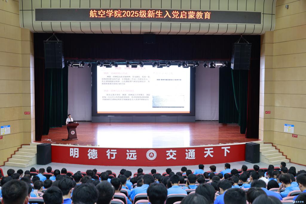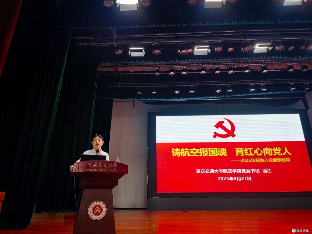 2025年9月27日下午,重庆交通大学航空学院在科学城校区学生活动中心二楼学术报告厅成功举办新生入党启蒙教育,学院党委书记潘江为2025级新生开展了主题为“铸航空报国魂 育红心向党人”的宣讲。此次教育活动紧扣青年成长与国家发展需求,从“两路”精神传承、时代使命担当、入党动机校准等方面展开,助力新生扣好人生“第一粒扣子”。