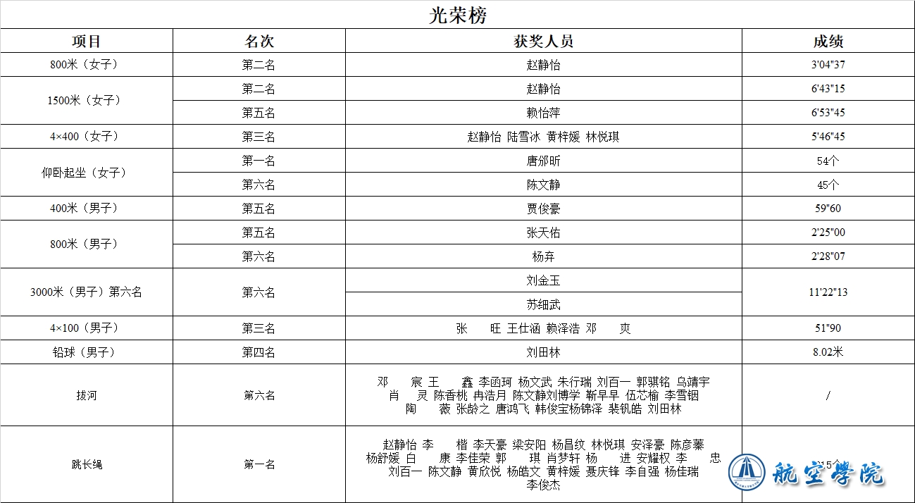 在为期两天的比赛中,航空学院运动员在多个项目中表现突出。女子方面,赵静怡在800米和1500米项目中均获得第二名,并与队友陆雪冰、黄梓媛、林悦琪合作夺得女子4×400米接力第三名;唐邠昕在仰卧起坐项目中以54个的成绩位列第一。男子项目中,张旺、王仕涵、赖泽浩、邓爽获得男子4×100米接力第三名;贾俊豪、张天佑分别在400米、800米项目中取得第五名;刘田林在男子铅球比赛中以8.02米获得第四名。此外,学院跳长绳代表队凭借稳定发挥,取得该项目第一名;拔河项目也获得第六名。