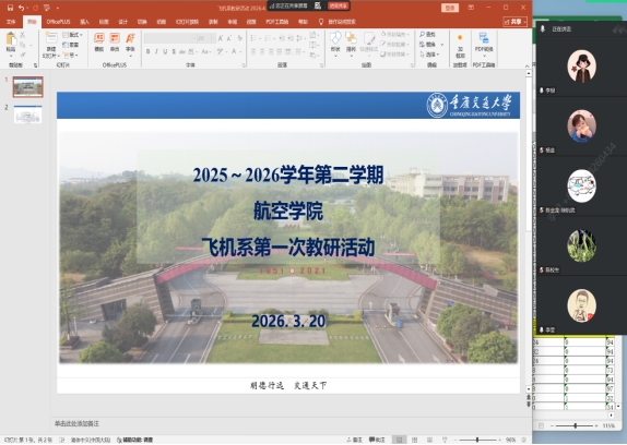 为深入贯彻落实学校教务处《关于本学期第一次教研活动安排的通知》精神,切实加强教学团队建设,提升航空专业人才培养质量,3月20日下午14:30,飞机系在致远楼334线下与线上同步组织开展了主题为“教学团队建设”的本学期第一次教研活动。